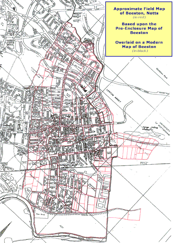 The map reproduced below, shows the pre-enclosure field structure (in red) overlaid on a map of present-day Beeston. |